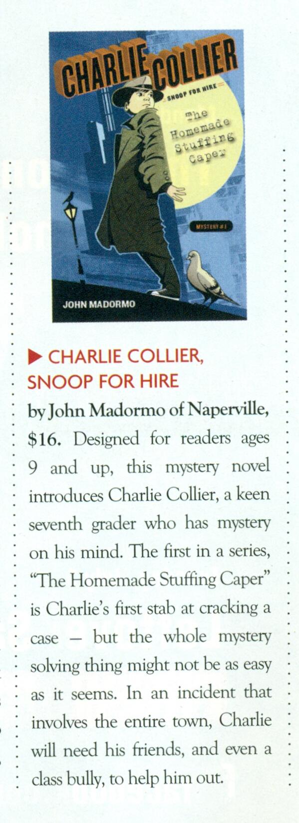 Charlie Collier is smart. Really, really smart. Ask him a question like "How many of each animal did Moses take on the ark?" and he'll be able to tell you in about five seconds that Moses didn't take any animals on the ark, it was Noah. But solving problems like this is too easy for Charlie. Iin fact, it's become downright boring. Charlie decides he wants to put his thinking skills to the test. So, just like his hero Sam Solomon, Private Eye, star of such thrilling books as The Bouncing Czechs Caper and The Going for Baroque Caper, Charlie decides to become Charlie Collier, Snoop for Hire. In The Homemade Stuffing Caper, the first book in a new series by John Madormo, Charlie teams with his best friend Henry to open his own detective agency. Charlie solves the mysteries, Henry makes sure they get paid.